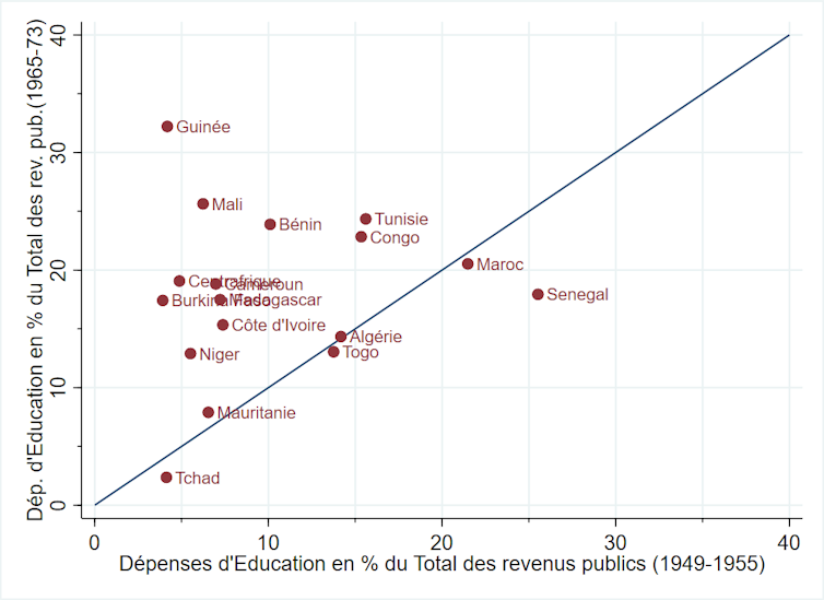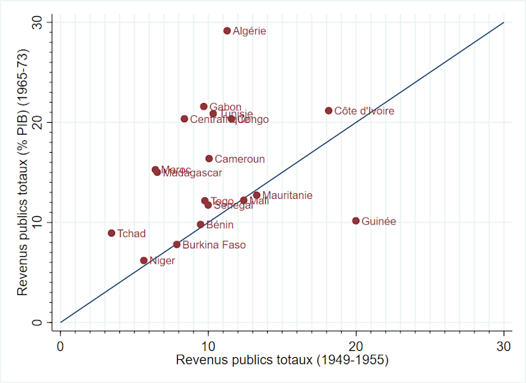 Tous les pays qui se situent sur la diagonale (Niger, Burkina Faso, Bénin, Sénégal, Togo, Mali, Mauritanie) ont pu collecter, dix ans après les indépendances, autant que durant la dernière période coloniale ; ceux qui sont au-dessus de la diagonale (Algérie, Gabon, Centrafrique, Tunisie, Congo, Cameroun, Maroc, Madagascar, Tchad et Côte d’Ivoire) ont augmenté leurs recettes publiques. Le seul pays qui collecte moins est la Guinée.