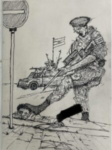 Transposées dans le contexte de la guerre, ces traditions confèrent au carnet une dimension ambivalente. Il documente la destruction, mais il peut aussi être compris comme une tentative de conjuration. Dessiner les violences, les morts, la ruine, c’est tenter de les contenir symboliquement, de leur imposer une forme. L’artiste ne travaille pas dans un vide culturel : il mobilise un vocabulaire visuel chargé d’histoire, de spiritualité et de pouvoir protecteur.
