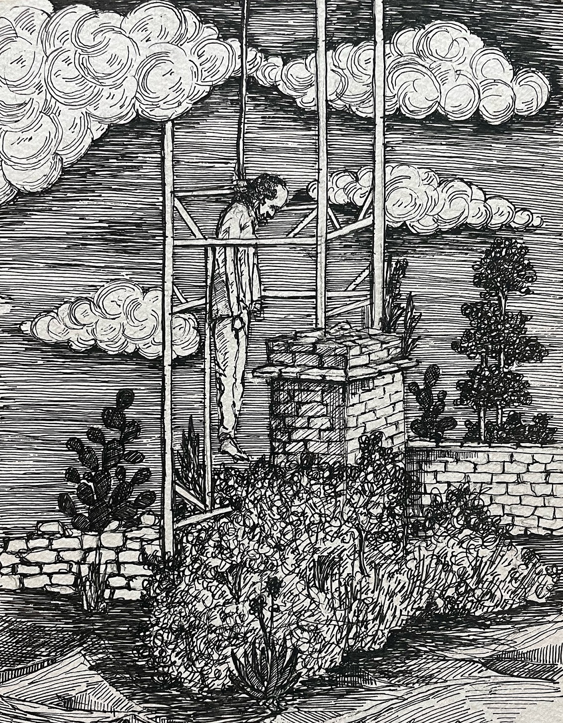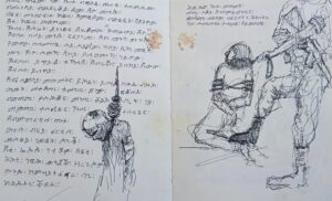 Mais les conditions ne sont pas celles de son travail à l’atelier. Il doit rester mobile, pouvoir se cacher et cacher ces dessins qui naissent désormais de manière presque compulsive. Toutes les scènes que Wedi Tsion a dessinées, il les a vues de ses propres yeux. Comme il le confesse, après cet événement et le choc des premiers temps du siège, l’horreur au quotidien devient un spectacle normal. Ces mots font écho à l’« habituation de l’horreur » décrite par Primo Levy à propos des camps nazis et ils rappellent la formule de Dostoïevski, lui-même survivant des camps sibériens, dans Souvenir de la Maison des Morts : « L’homme est un animal qui s’habitue à tout ».