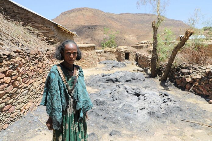 Femme tigréenne devant des récoltes brûlées (Photo Tedros G. Belay).