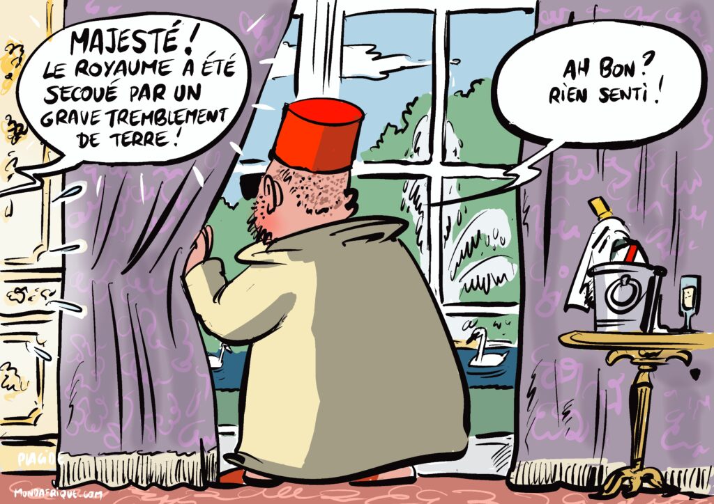Durant les premières heures qui ont suivi le séisme et alors que la plupart des pays exprimaient leur solidauté, , le Roi du Maroc qui se trouvait à Paris a brillé par son absence avant d’apparaître samedi 9 septembre lors d’une réunion de travail à Rabat, des images qui tournent en boucle depuis. Selon les informations parues désormais dans toute la presse Mohammed VI se trouvait en France. La première réaction du Palais aura été un communiqué signé par le seul cabinet du Roi