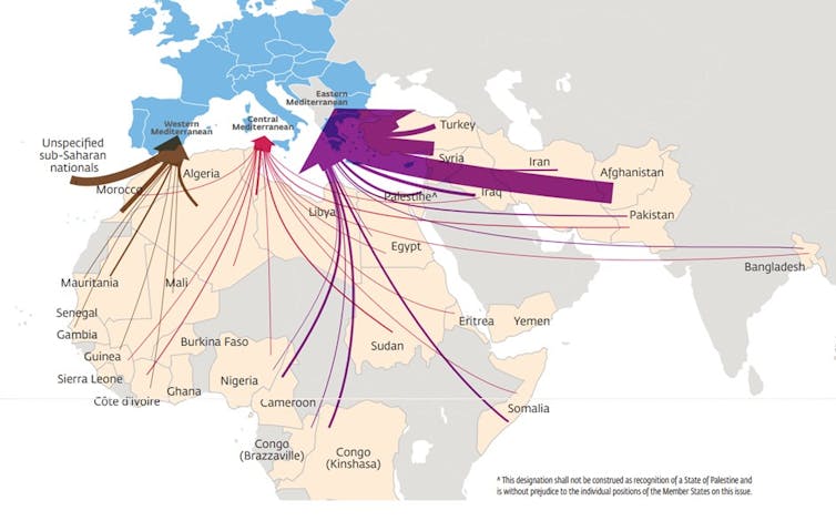 Selon les Nations unies, il y avait en 2018 trois grandes routes migratoires vers l’Europe, toutes impliquant la traversée de la mer Méditerranée : la route de la Méditerranée centrale – de l’Afrique du Nord (principalement la Libye) à l’Italie (souvent en Sicile) ; la route de la Méditerranée orientale – de la côte turque à diverses îles grecques ; la route de la Méditerranée occidentale – du Maroc à l’Espagne. Frontex y ajoute une route d’Afrique de l’Ouest et une route terrestre des Balkans occidentaux.