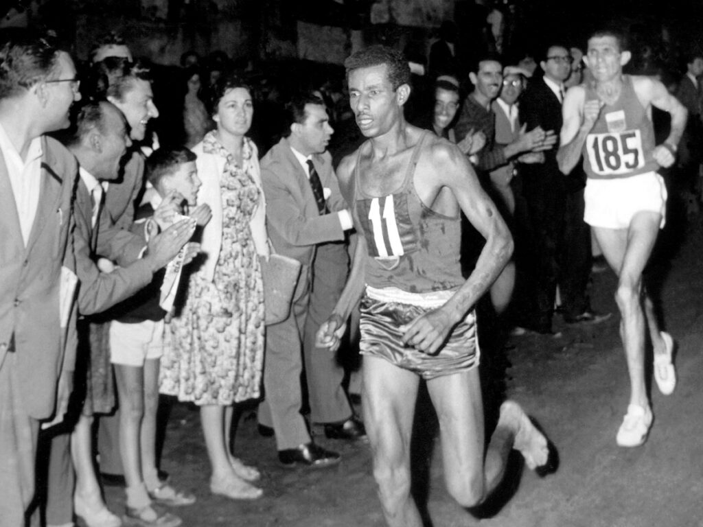 Né à Addis-Abeba le 7 août 1932, le jour-même du marathon des Jeux de los Angeles, Abebe Bikila se révèle aux yeux du monde lors de celui des Jeux de Rome, le 8 septembre 1960. Vainqueur en 2h15mn16s, huit minutes de mieux que le record olympique de Zatopek et une seconde plus vite que le meilleur temps jamais réussi, le jeune Ethiopien est sans rival et remporte la première médaille d’or de l’histoire de son pays sur les terres de son ancien colonisateur, dans une ville dont l’architecture porte encore, çà et là, les stigmates de la période fasciste. Au départ de la course, le dossard numéro 11 de ce coureur sans grande référence n’attire pourtant guère l’attention des observateurs, quand ceux-ci ne le prennent pas de haut en raison de ses pieds nus.