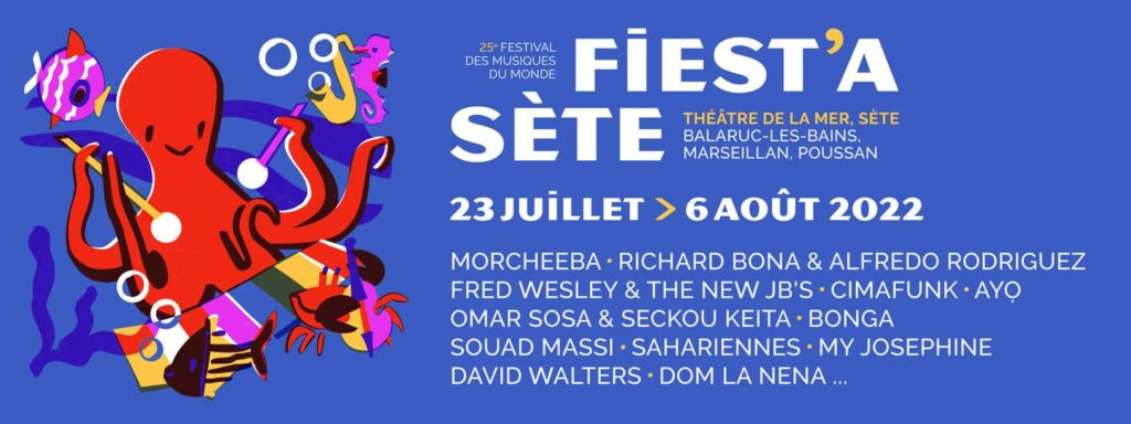 Le festival Fiest’a Sète a lieu jusqu’au 6 août 2022 au théâtre de la mer à Sète, un lieu paradisiaque et idéal pour un festival d’été. Ce festival festif, dansant et aux sonorités des musiques du monde, accueille une diversité d’artistes venus des quatre coins du monde. Ce voyage musical s’arrêtera entre autres dans les pays d’Afrique et de l’Orient : au Sénégal avec Seckou Keita, accompagné du Cubain Omar Sosa, au Cameroun avec Richard Bona, accompagné du Cubain Alfredo Rodriguez, en Angola avec Bonga ; et en Algérie, au Maroc, en Mauritanie et au Sahara occidental avec le groupe à quatre voix « Sahariennes ».