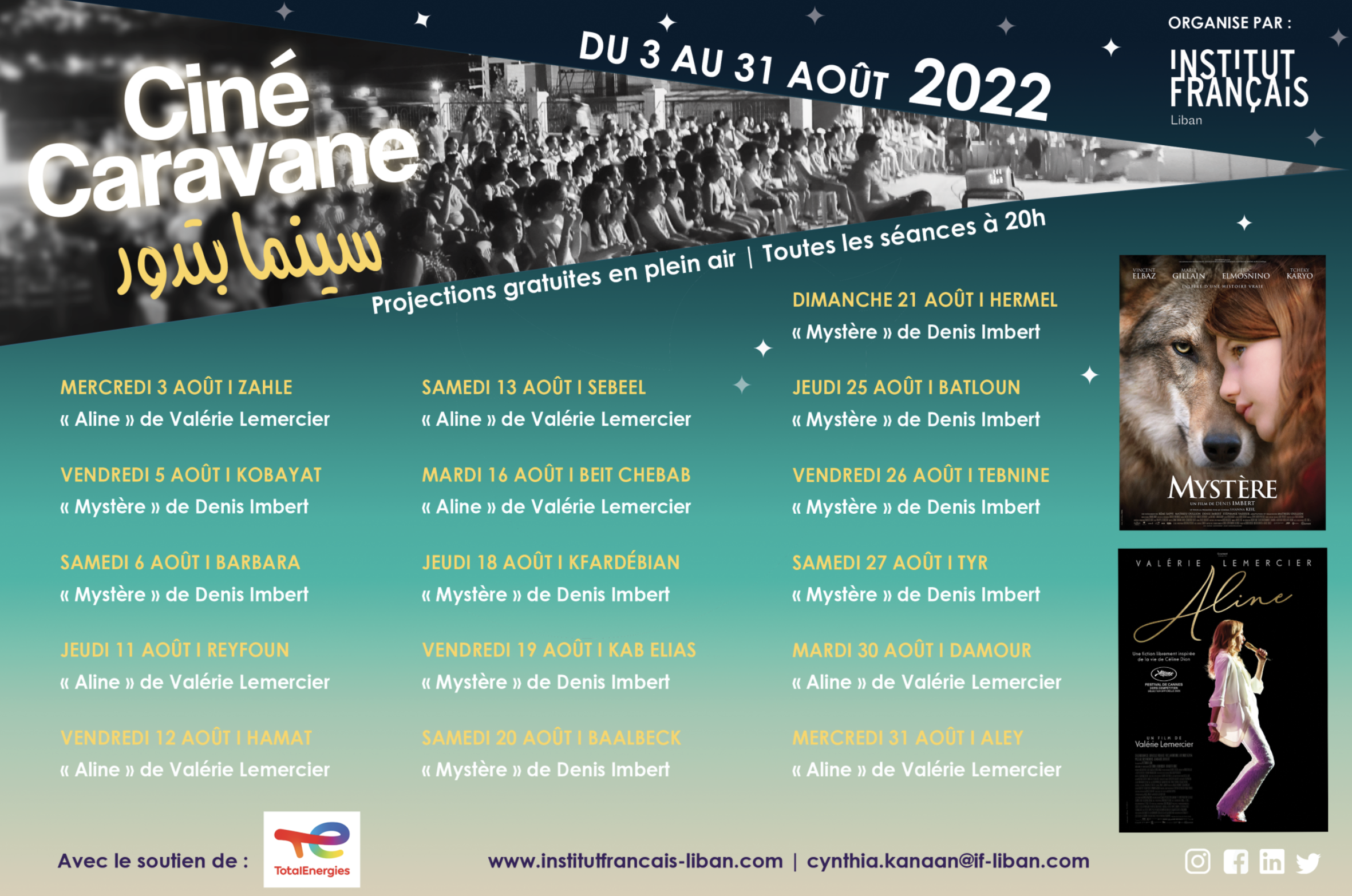 Le Ciné Caravane de l’Institut Français au Liban, qui existe depuis 2009, va sillonner à nouveau, durant le mois d’août, 16 villages libanais n’ayant pas accès au cinéma. Deux films seront projetés sur grand écran et gratuitement : « Aline » de Valérie Lemercier un hommage à Céline Dion et « Mystère » de Denis Imbert une belle histoire d’amitié entre une jeune fille de 8 ans et un loup.