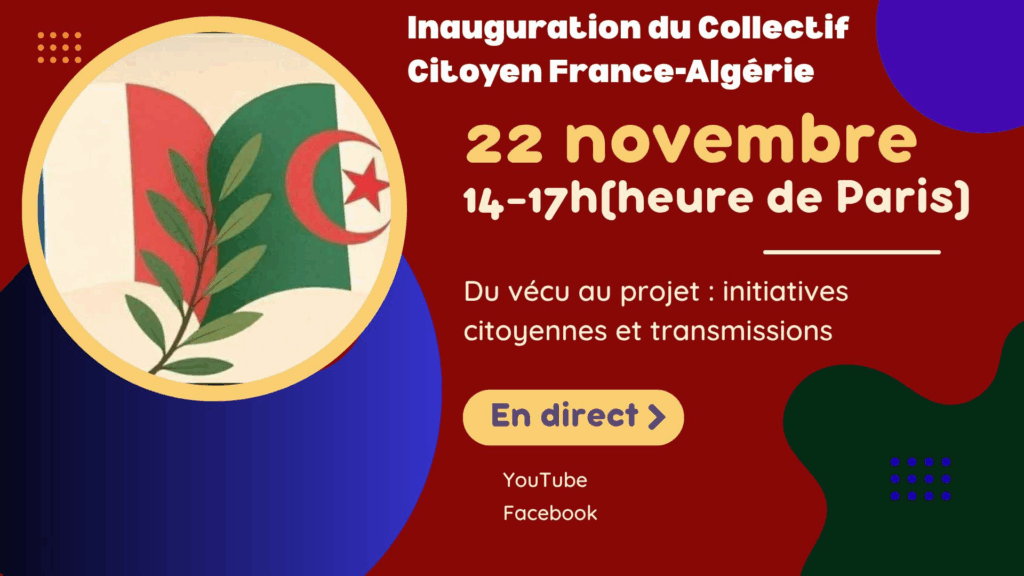 À la suite de la publication, le 16 août 2025, de la « Lettre ouverte aux présidents Macron et Tebboune », les premiers Signataires ont décidé de créer le Collectif Citoyen France-Algérie pour un dialogue citoyen et solidaire entre les deux Paysdont le lancement aura lieu le 22 novembre 2025 de 10h à 17H00.