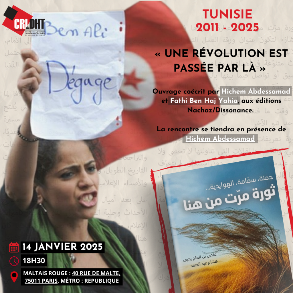 À l’occasion du 14e anniversaire de la révolution tunisienne (17 décembre 2010-14 janvier 2011), le Comité pour le Respect des Libertés et des Droits de l’Homme en Tunisie (CRLDHT) organise une rencontre le 14 janvier à 18h30 au Maltais rouge, 40 rue de Malte à Paris, pour commémorer cette date historique, une date qui avait marqué le début d’une transition démocratique en Tunisie trahie depuis le coup d’État du 25 juillet 2021.