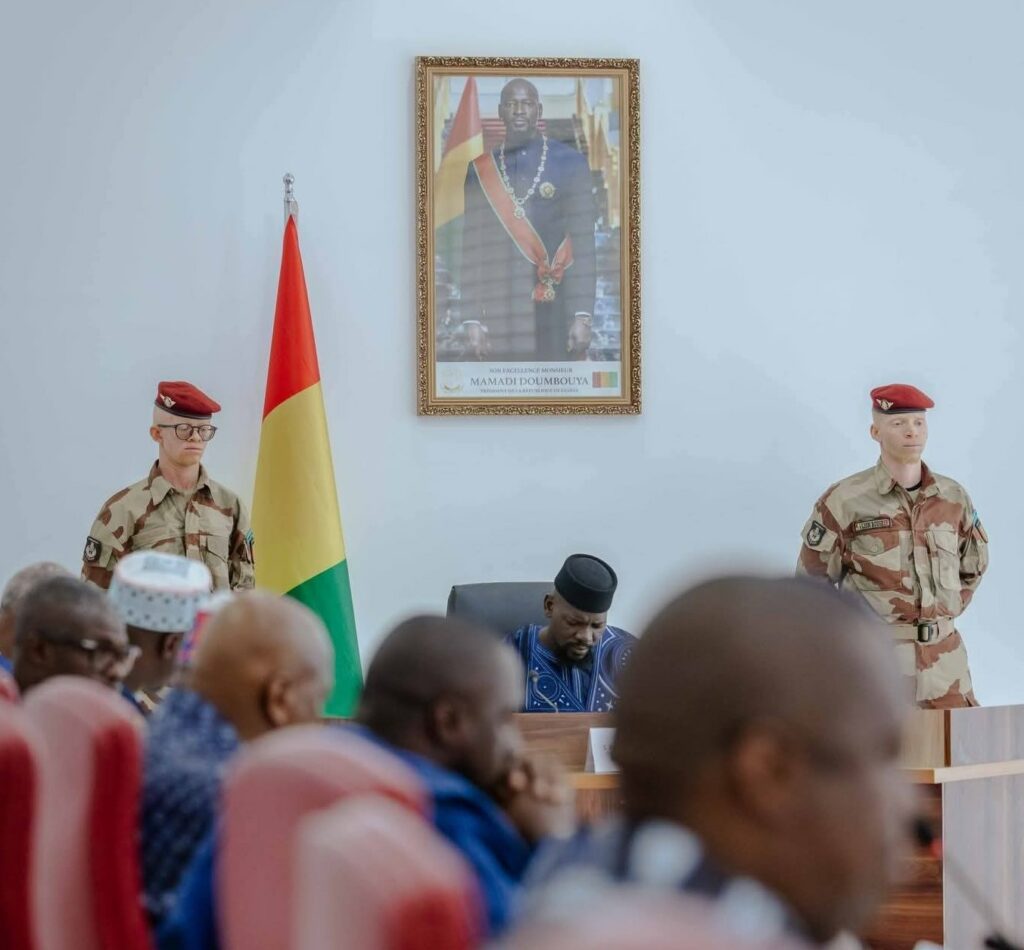 Plusieurs épisodes récents sont particulièrement marquants. En avril 2026, une photo (voir ci-dessus) montre Mamadi Doumbouya, en tenue officielle, au centre, légèrement en avant. Derrière lui, de part et d’autre, se tiennent deux jeunes militaires albinos en uniforme, en position de sécurité rapprochée. Les thuriféraires du régime veulent y voir un message contre les discriminations, dans un contexte où les personnes atteintes d’albinisme sont victimes de préjugés, de stigmatisation et parfois de violences. Cependant, la majorité des Guinéens avancent une tout autre interprétation. Les albinos sont associés à une capacité à protéger, à voir « clair dans le noir » et ainsi à déceler les complots. À la lumière d’autres faits, cette seconde lecture est sans conteste la plus plausible.