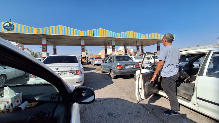Téhéran, 15 juin 2025 : des Iraniens font la queue à une station-service. Une limite de dix litres par véhicule a été instaurée. ziizooart/Shutterstock