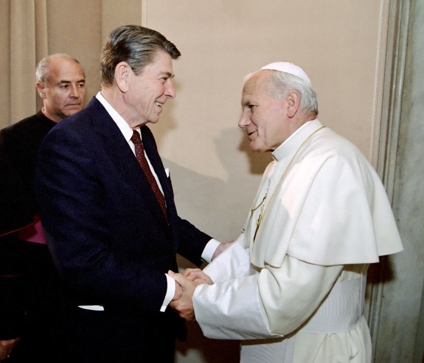 Cette différence est essentielle, car la mémoire de Jean-Paul II est indissociable non seulement de sa propre force morale, mais aussi du type de monde dans lequel il avait à agir. Il affrontait un adversaire que l’on pouvait nommer, situer, et combattre à l’intérieur d’une structure de pouvoir identifiable. Le communisme soviétique était redoutable, coercitif, impérial ; mais c’était encore un système. Il disposait d’institutions, de doctrines, de hiérarchies, et même d’une certaine gravité tragique. Jean-Paul II trouva aussi en Ronald Reagan un président américain qui, quelles que soient les réserves que l’on puisse nourrir à l’égard de son idéologie, évoluait encore dans une conception sérieuse du pouvoir. Reagan était entouré de figures de premier plan — George Shultz, Brent Scowcroft, Caspar Weinberger, James Baker — des hommes formés par la hiérarchie, la prudence, la discipline institutionnelle et la mémoire de l’État. Leur relation comptait parce qu’elle reliait l’autorité morale au sérieux politique. Cette affinité singulière transparaissait jusque dans leurs échanges épistolaires, dont l’ampleur véritable reste encore en partie dissimulée, une grande partie des archives demeurant classifiée. Au-delà même de leur entente personnelle, l’essentiel est ailleurs : tous deux vivaient encore dans un monde où la conscience et la raison d’État pouvaient se reconnaître l’une l’autre.