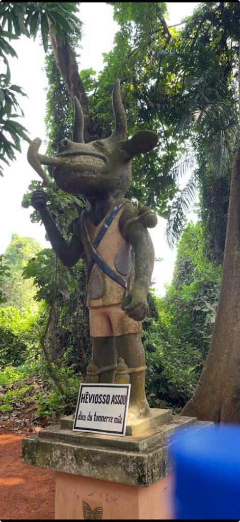 Et puis il y a la route des esclaves qui se termine à la Porte du Non-Retour. Elle commence à la « Place Chacha » en face de la résidence familiale des de Souza, où les esclaves étaient vendus sous un grand arbre. La route fait quatre kilomètres jusqu’à la mer, où les esclaves étaient embarqués dans de petites pirogues qui les conduisaient vers les bateaux qui ne pouvaient pas accoster à cause du phénomène de la barre. Le chemin était jalonné de plusieurs escales, aujourd’hui matérialisées par plusieurs places et statues.