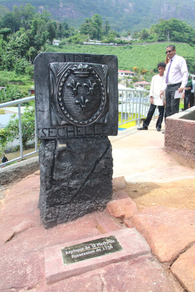 Orné de trois fleurs de lys, du cordon de Saint-Esprit et de la couronne royale, La Pierre de La Possession porte également l’inscription « Séchelles », du nom de Jean Moreau de Séchelles, ministre des Finances de Louis XV. Au fil des ans, le nom a été modifié, devant ainsi Seychelles. Avant les Français, des navigateurs arabes, portugais et anglais avaient découvert l’archipel. Le capitaine Lazare de Picault, envoyé par le gouverneur-général des Mascareignes, Bertrand Jean François Mahé de La Bourdonnais, avait débarqué sur l’île principale qu’il baptisa Mahé.