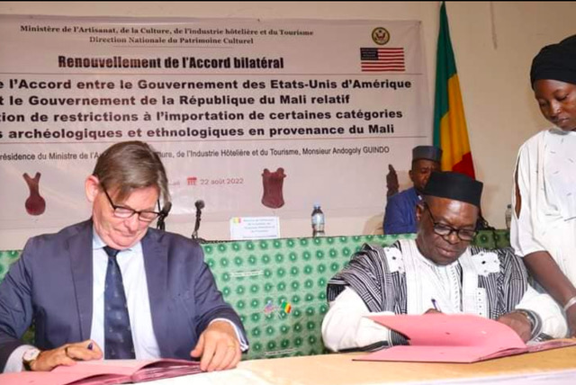 Les États-Unis ont renouvelé pour la septième fois leur engagement avec le Mali sur le retour des biens culturels issus de fouilles et de pillages, saisis par les douanes américaines. Le document a été signé le 22 août dernier au Musée national à Bamako entre le ministre de la Culture, Andogoly Guindo, et l’ambassadeur des États-Unis au Mali, Denis Bruce Hankins.