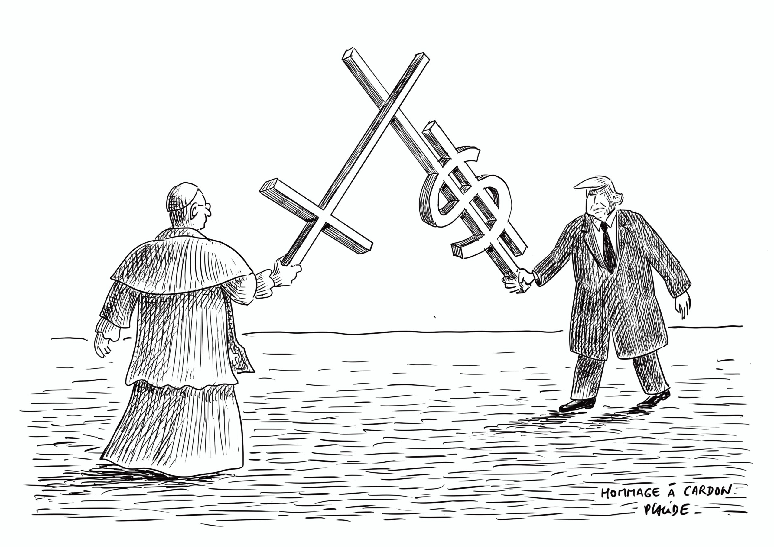 Par un dessin réalisé « à la manière de » sur Trump et le Pape, Placide rend hommage au dessinateur et caricaturiste Jacques-Armand Cardon, qui a été l’un des noms emblématiques du Canard enchaîné, et qui est mort récemment à Angers, à l’âge de 89 ans. Le dessinateur, qui signait simplement Cardon, avait un style très reconnaissable qu’on peut reconnaitre sur le dessin ci dessus: des personnages souvent croqués de dos, un graphisme tout en hachures, peu ou pas de bulles. Entré au Canard enchaîné en 1973, il a aussi collaboré à Hara-Kiri, Siné-Massacre, L’Humanité, ou encore Le Monde.