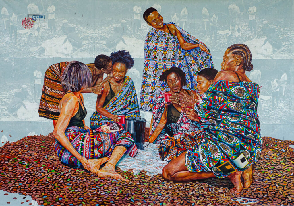 Ses tableaux, chargés de motifs et de signes, évoquent une Afrique qui regarde l’histoire droit dans les yeux, sans jamais perdre sa capacité de subversion et d’ironie. Un humour noir, incisif, qui sert à démasquer l’ordre établi.