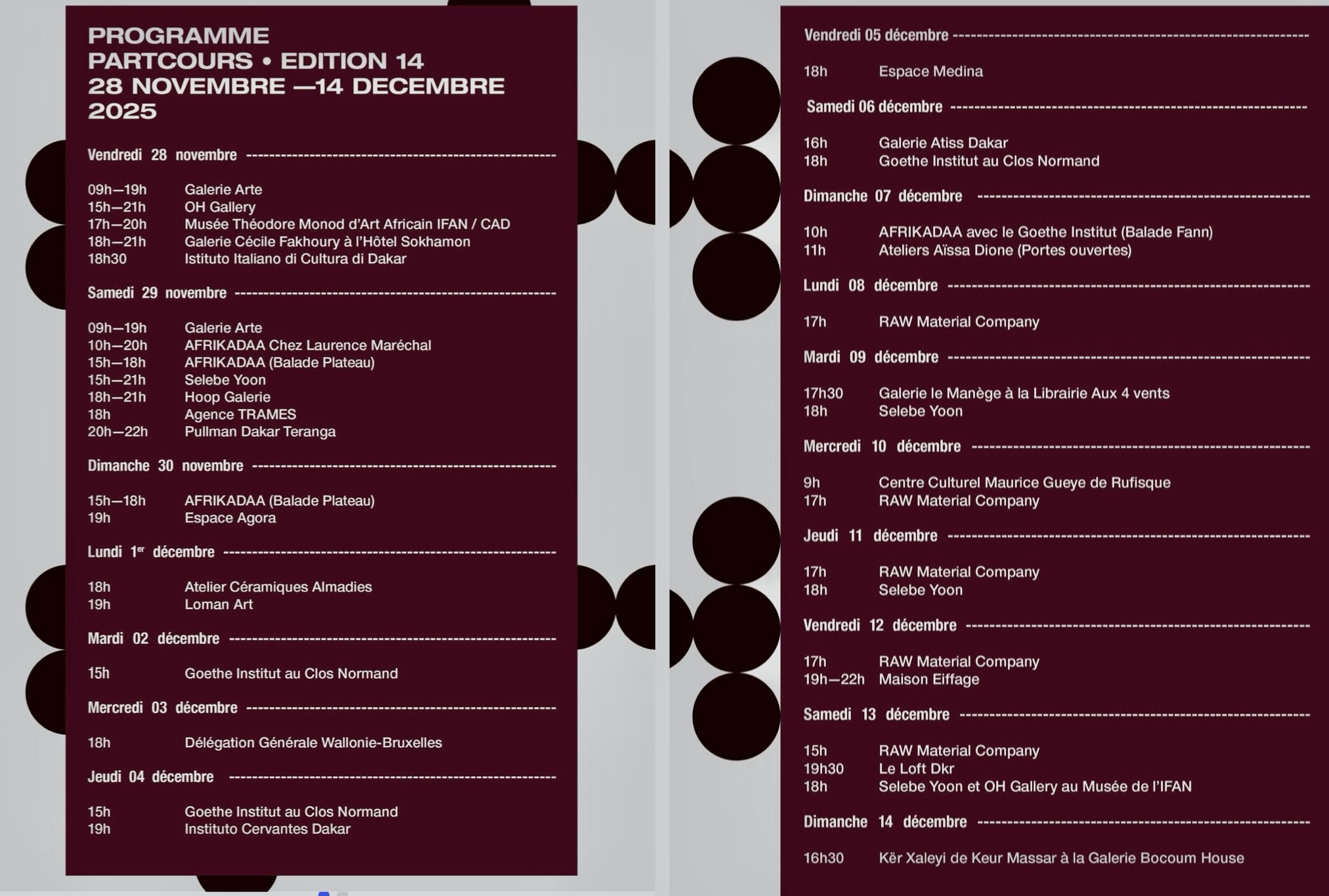 – Lieux : plus de 30 galeries, ateliers, espaces alternatifs à Dakar (Plateau, Médina, Almadies, Ouakam, banlieues, etc.)