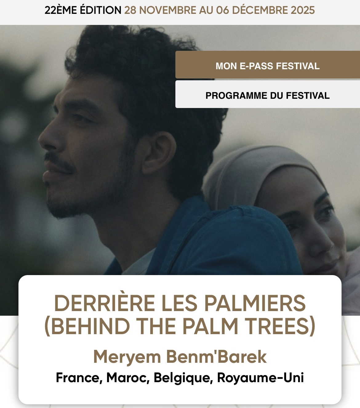 La première mondiale du film à Marrakech prend alors tout son sens. Dans un festival marqué par la présence d’un jury international, présidé par Bong Joon-ho, Derrière les palmiers fait figure de proue d’un cinéma marocain qui ose. Il s’ouvre au monde sans renier ses spécificités. Il interroge, mais ne donne pas de réponses toutes faites. La sélection de ce film en compétition officielle marque aussi une reconnaissance pour sa réalisatrice. Meryem Benm’Barek confirme sa capacité à inscrire des histoires locales dans des enjeux universels.