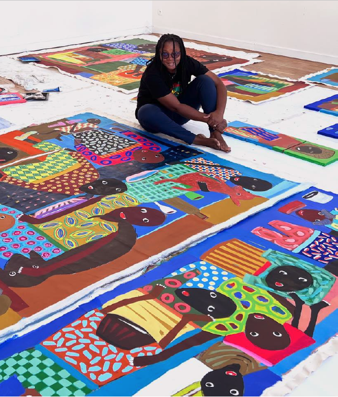 Dans ses tableaux vifs et colorés, où les personnages saturent l’espace de la toile, on retrouve la polychromie des tissus africains, du wax, à l’image de Klimt qui a incorporé dans ses œuvres toute l’avant-garde des tissus de la sécession viennoise.