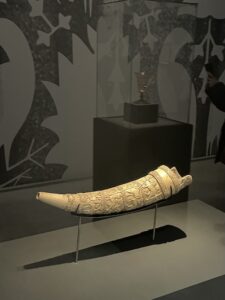 L’olifant (ou cor) d’ivoire sculpté que l’on peut voir ci-dessus a longtemps été vénéré comme une relique de Roland, le neveu de Charlemagne, mort à la bataille de Roncevaux en combattant les Arabes, chassés de Syrie vers l’Espagne au VIIIe siècle. En réalité, il n’en est rien. L’Orient nourrit fantasmes et légendes. L’olifant date seulement du XIe siècle. Son lieu de fabrication demeure inconnu.