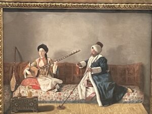 La bonne société de l’époque souhaite alors vivre à l’heure de ces Ottomans si prisés par les cours royales. C’est ainsi qu’au cœur du XVIIIe siècle, Jean-Étienne Liotard (1702-1789), surnommé « le peintre turc », réalise une œuvre de commande représentant un commerçant anglais habillé à la turque, ainsi que son épouse, fille d’un consul français, dont la tenue s’inspire des codes vestimentaires alors en vogue à Istanbul (voir l’image ci-dessus).