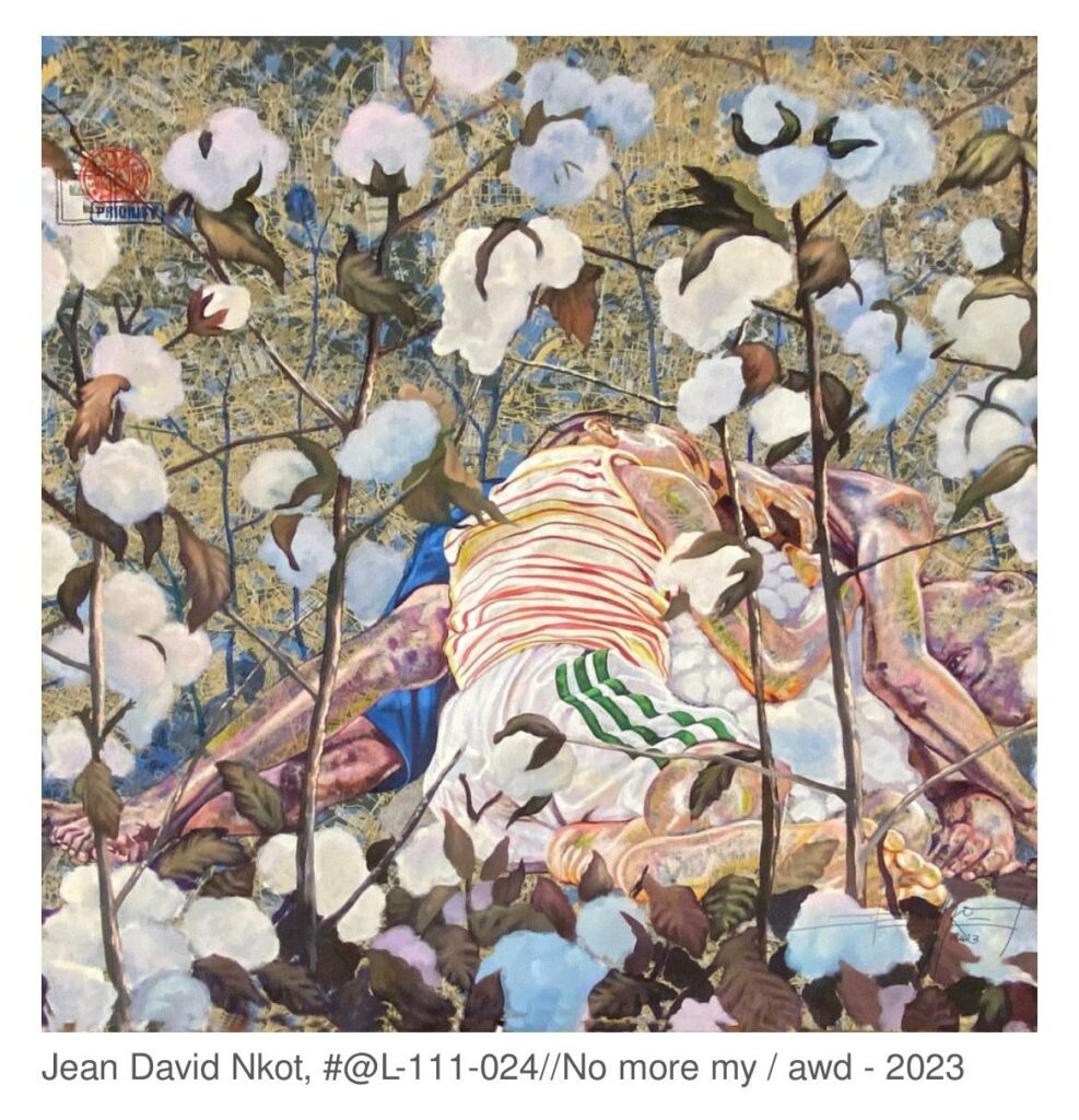 Jean David Nkot est aujourd’hui une figure essentielle de la nouvelle peinture africaine. Formé à l’Institut des Beaux-Arts de Foumban puis à Douala, son travail a depuis traversé les continents, salué pour son acuité politique et sa maîtrise plastique. À la Galerie Afikaris, il déploie toute sa maturité esthétique. Chaque œuvre est une enquête. Chaque toile exige du temps. Le spectateur est invité à ne pas regarder, mais à lire, à déchiffrer, à se confronter à une mémoire cartographiée sur la peau même des personnages.