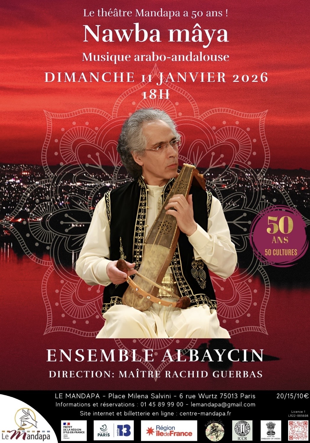 Présenté dans le cadre des 50 ans du Théâtre Mandapa, ce concert s’inscrit dans une programmation attentive aux formes musicales structurées et aux démarches de recherche. Il offre l’occasion d’entendre une nawba pensée comme un ensemble organique, construite dans le respect de ses règles internes et portée par une pratique collective exigeante.