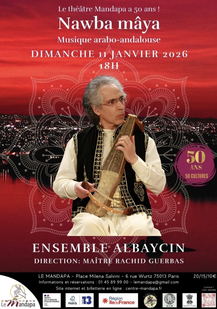 Le dimanche 11 janvier 2026 à 18 heures, l’Ensemble Albaycin se produira au Théâtre Mandapa avec un programme consacré à la Nawba Mâya. Sous la direction de Rachid Guerbas, ce concert propose une lecture construite et rigoureuse de l’un des cycles les plus structurés du répertoire arabo-andalou algérien.