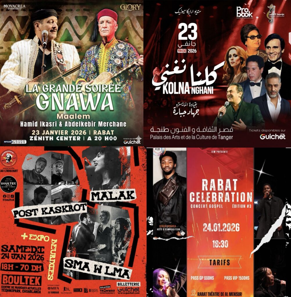 Concerts : 23 janvier – Kolna Nghani, Théâtre Palais des Arts et de la Culture, Tanger 23 janvier – La Grande Soirée Gnawa (Hamid El Kasri & Abdelkebir Merchane), Zénith de Rabat