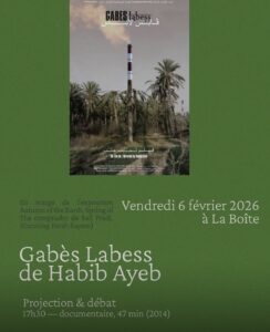 Vendredi 6 février 2026, le public est invité à découvrir Gabès Labess, un film documentaire réalisé par Habib Ayeb, à l’occasion d’une projection organisée en marge de l’exposition Autumn of the Earth, Spring of the Comprador de Saif Fradj, curatée par Farah Sayem. La séance sera suivie d’un temps d’échange, prolongeant la réflexion autour des enjeux environnementaux et sociaux contemporains en Tunisie.