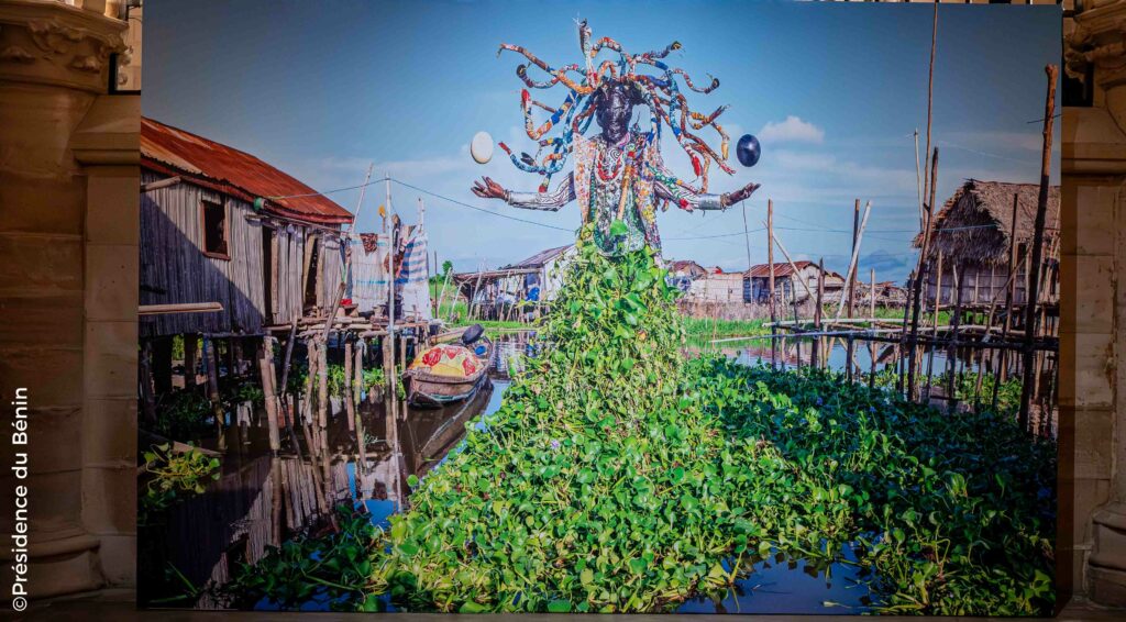 Avec des femmes et des hommes, les artistes regardent le monde qui les entourent. L’oiseau à la tête tournée en arrière, Sankofa souligne l’importance d’apprendre du passé. Fabrice Monteiro dénonce la civilisation du jetable et la pollution du continent africain. La photo monumentale, The Prophecy (photo) mets en scène une divinité à la robe en jacinthes d’eau. Venues d’Europe pour décorer des jardins, elles ont envahi entre autres le lac Nokoue. Le casque d’écran orné de cauris (photo), Vodunaut, Hyperceiver d’Emo de Medeiros est inspirée de l’art traditionnel béninois mais les nouvelles technologies transforment chacun en voyageur du futur.