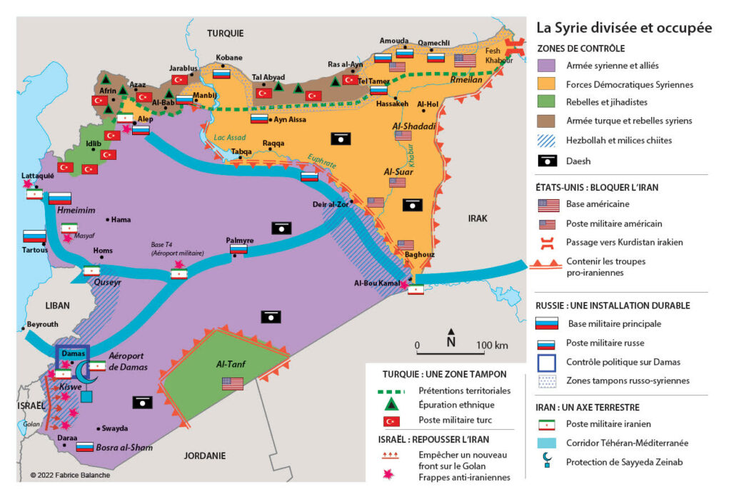 « Nous sommes dans un conflit gelé car les grandes offensives sont terminées depuis avril 2020, date de la dernière avancée de l’armée syrienne à Idleb. Les belligérants campent sur leurs positions respectives, qu’il s’agisse des acteurs internationaux (Russie, États-Unis, Turquie, Iran et Israël) ou des acteurs locaux (régime syrien, Forces démocratiques syriennes [FDS], le groupe djihadiste Hayat Tahrir al-Sham et autres milices rebelles). Le seul qui ne respecte pas ce modus vivendi c’est Daech, qui est retourné dans la clandestinité après la chute de son dernier fief territorial, Baghouz en mars 2019. L’organisation terroriste a recruté une nouvelle génération de combattants, qui multiplient les attaques contre les FDS et l’armée syrienne. En janvier 2022, Daech a lancé une attaque d’envergure contre la prison de Hassaké, où se trouvent des centaines de combattants prisonniers.