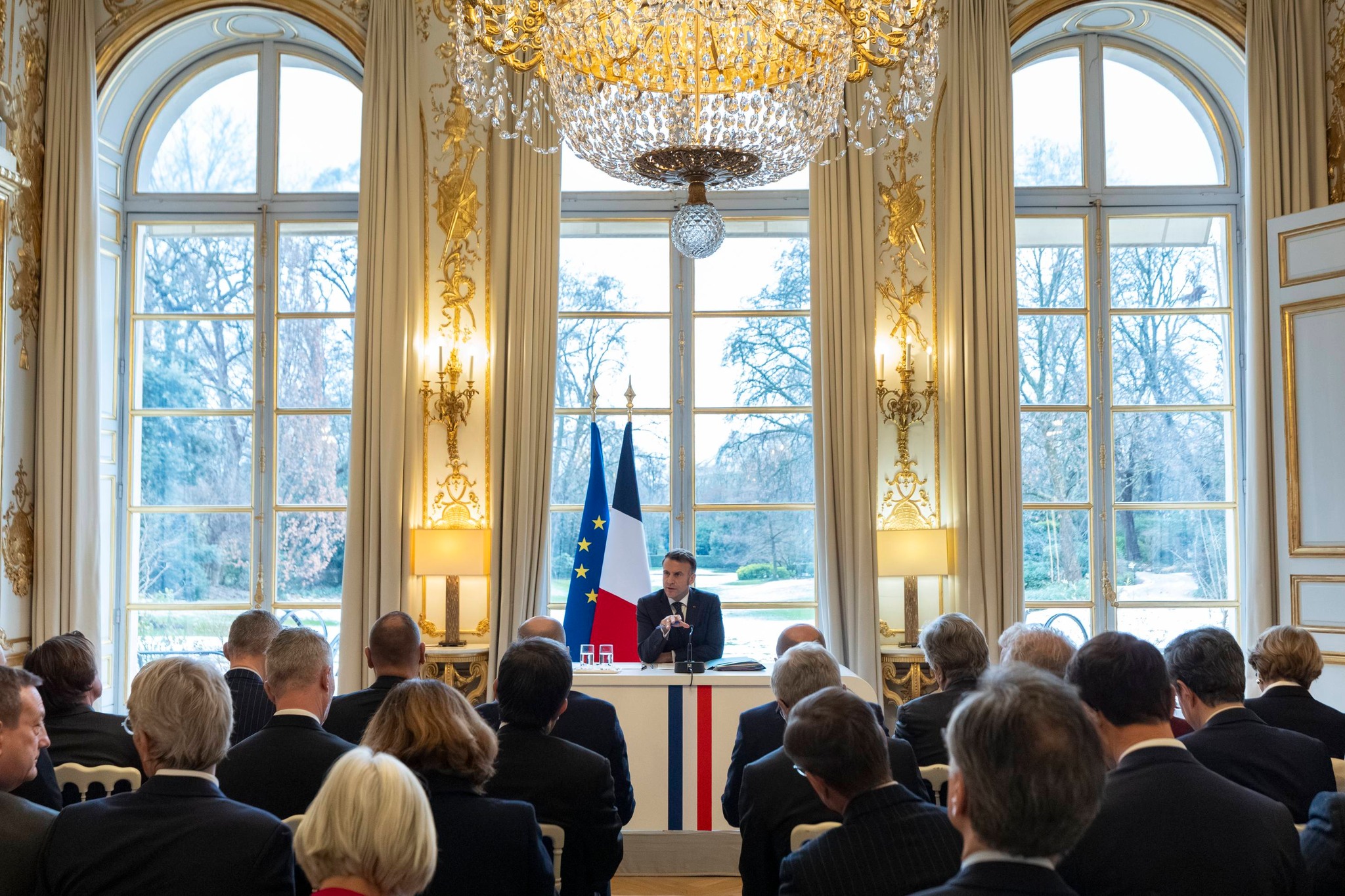 Emmanuel Macron à l'Elysée, s'adressant aux ambassadeurs français, le 8 janvier 2026.