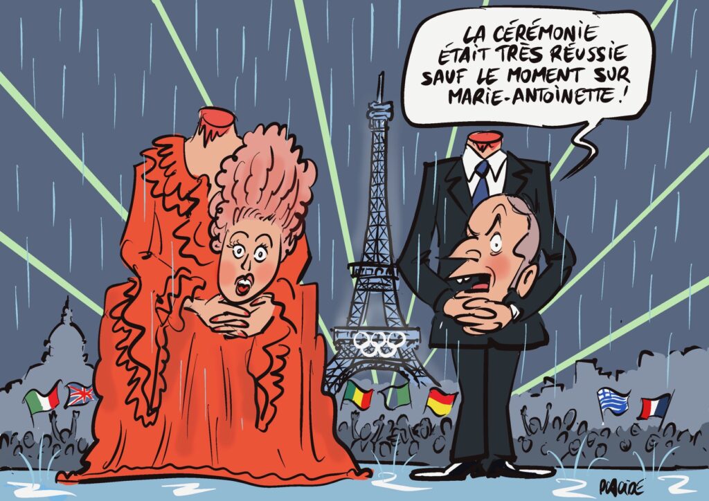 Notre dessinateur Placide risque une comparaison amusée entre la reine Marie-Antoinette guillotinée et un Emmanuel Macron plongé, après l’euphorie des J0, dans les affres de la désignation presque impossible d’un Premier ministre, alors que l’Assemblée française, depuis les scrutins de juillet, apparait divisée en trois blocs irréductibles. Aucune majorité viable n’apparait sur le papier sauf dans les rêves les plus fous d’un Président français qui veut croire que l’enthousiasme des Français durant les JO serait un chèque en blanc en sa faveur.