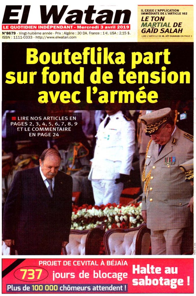 La démission du président Bouteflika saluée par la presse algérienne La redaction de Mondafrique il y a 7 ans El Moudjahid PUBLICITÉ L’Expression Le Soir Le Temps El Biled El Khabar PUBLICITÉ Liberté Reporters El Watan