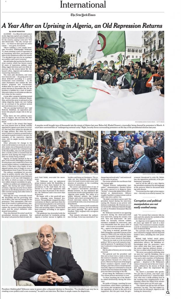 Le soulèvement de la rue qui a commencé l’année dernière, connue sous le nom de Hirak, avait d’abord paru annoncer une nouvelle ère, dans un pays longtemps étouffé par ses militaires. Mais l’incapacité du mouvement à se regrouper derrière des dirigeants et à s’accorder sur des objectifs a créé un vide. Les vestiges de l’appareil répressif algérien et ses puissants services de sécurité sont rapidement intervenus pour le combler.