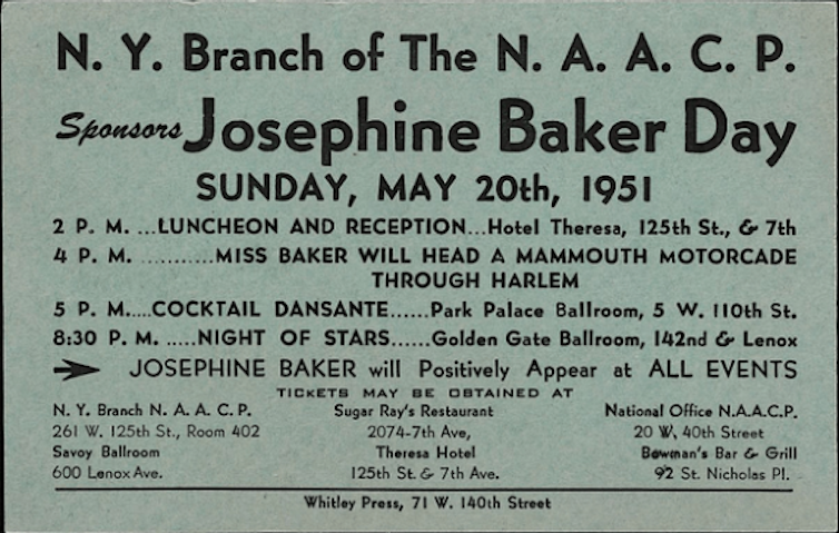 L’Association nationale pour la promotion des gens de couleur (NAACP) s’honore cependant de recevoir « la célébrité internationale, Joséphine Baker ». Le 20 mai 1951, elle organise le Baker Day, une grande parade dans les rues de Harlem suivie d’un banquet. L’événement donne l’occasion de se pencher sur l’attitude des diplomates français à l’égard de la turbulente artiste, naturalisée française depuis 1937. Pour le Baker Day, l’ambassade ne donne pas suite à l’idée d’associer « les représentants de la jeunesse française », mais le consul général Roger Seydoux est présent.