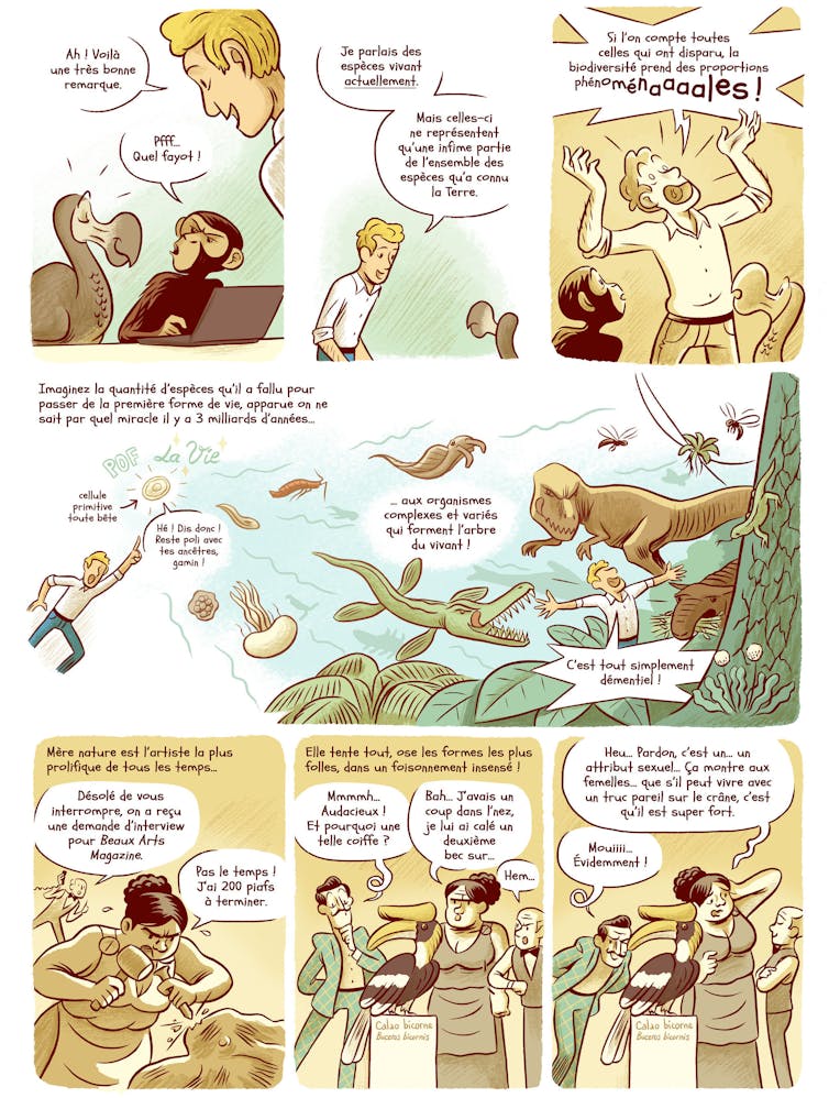 L’Héritage du dodo, c’est une bande dessinée pour tout comprendre à la crise du climat et de la biodiversité. Chaque semaine, on explore la santé des écosystèmes, on parle du réchauffement climatique mais aussi de déforestation, de pollution, de surexploitation… On y découvre à quel point nous autres humains sommes dépendants de la biodiversité, et pourquoi il est important de la préserver. On s’émerveille devant la résilience de la nature et les bonnes nouvelles que nous offrent les baleines, les bisons, les loutres…
