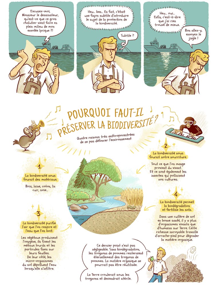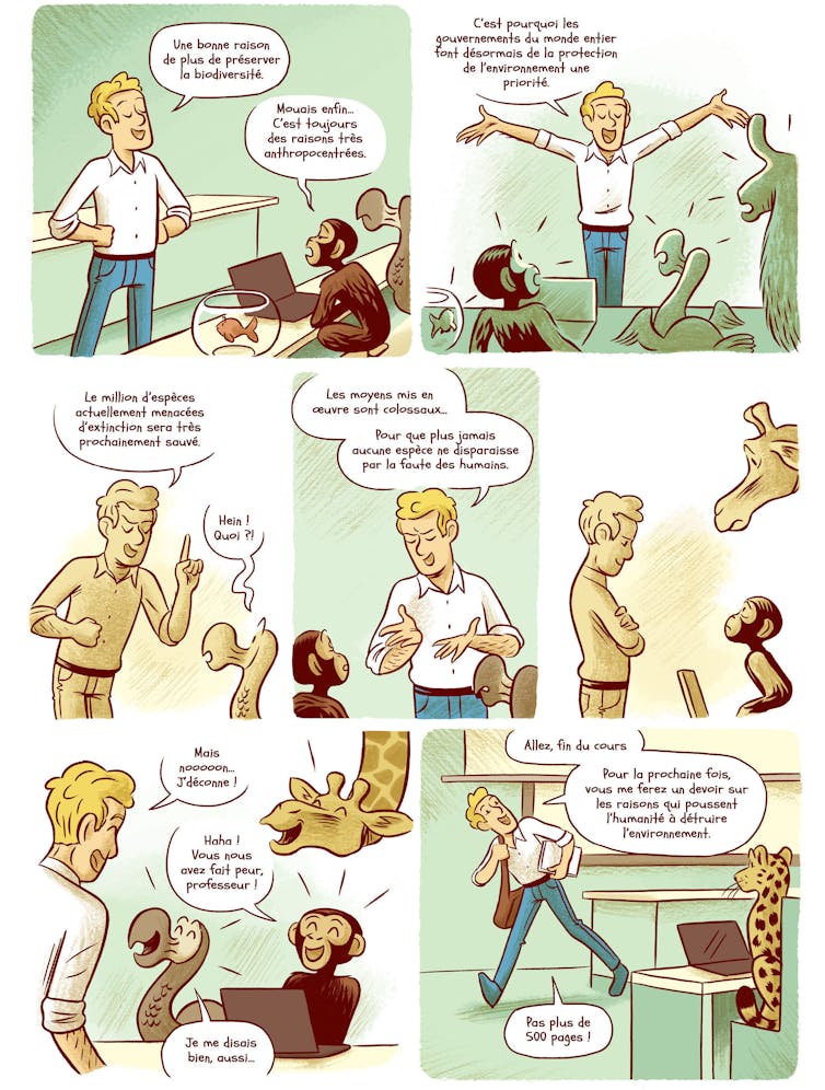 On décortique les raisons profondes qui empêchent les sociétés humaines d’agir en faveur de l’environnement. On décrypte les stratégies de désinformation et de manipulation mises au point par les industriels et les climatosceptiques. Le tout avec humour et légèreté, mais sans culpabilisation, ni naïveté. En n’oubliant pas de citer les motifs d’espoir et les succès de l’écologie, car il y en a !l