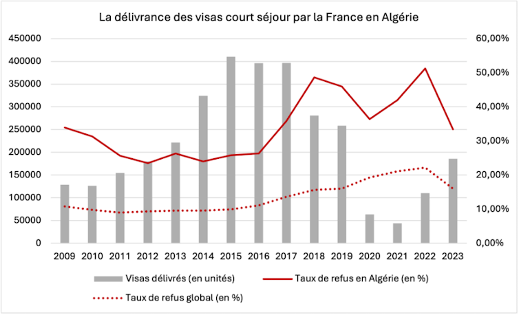 Si les règles sont fixées à Bruxelles, chaque État dispose de marges de manœuvre importantes pour les mettre en œuvre et évaluer chaque demande en fonction de ses sensibilités politiques et diplomatiques. Les statistiques de visas octroyés et refusés par les consulats français en Algérie, rendues publiques par la Commission européenne depuis 2009, mettent en évidence une délivrance singulièrement restrictive. Les Algériens et les Algériennes subissent des taux de refus largement supérieurs aux autres nationalités (33 % de demandes refusées contre 16 % pour la moyenne globale en 2023).